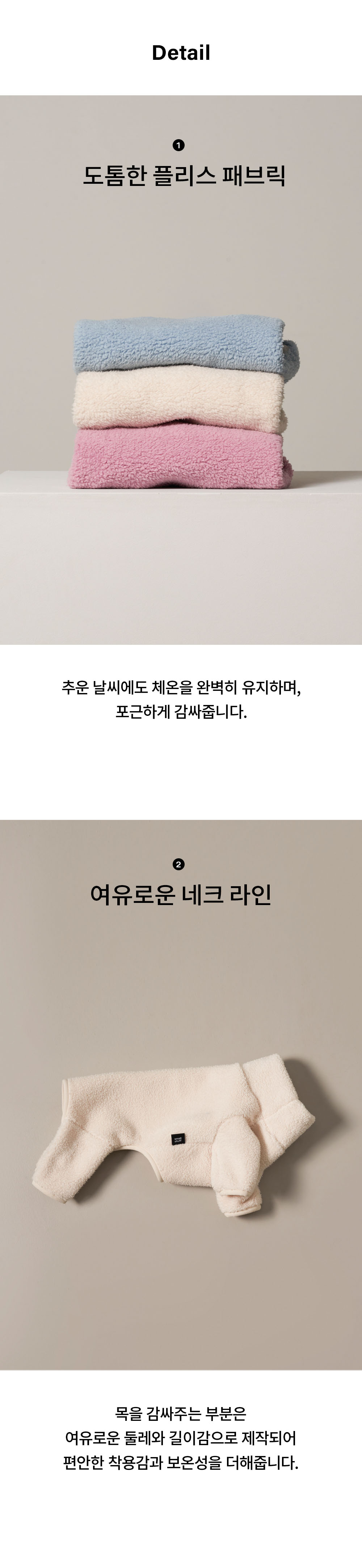 부드럽고 따뜻한 플리스 소재로 제작된 올인원으로, 한겨울 외출에도 걱정 없이 입을 수 있습니다. 군더더기 없는 심플한 디자인과 편안한 착용감이 특징이며, 사랑스러운 핏으로 겨울 데일리 룩을 완성해 줍니다. 3가지 컬러 옵션으로 스타일에 맞게 선택할 수 있습니다.