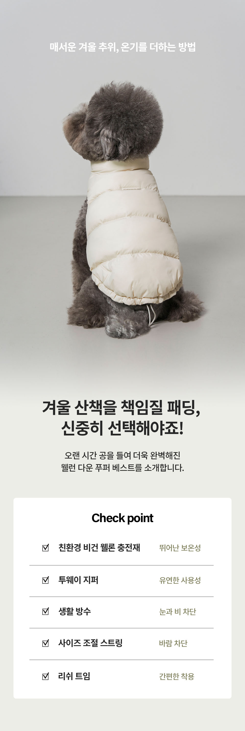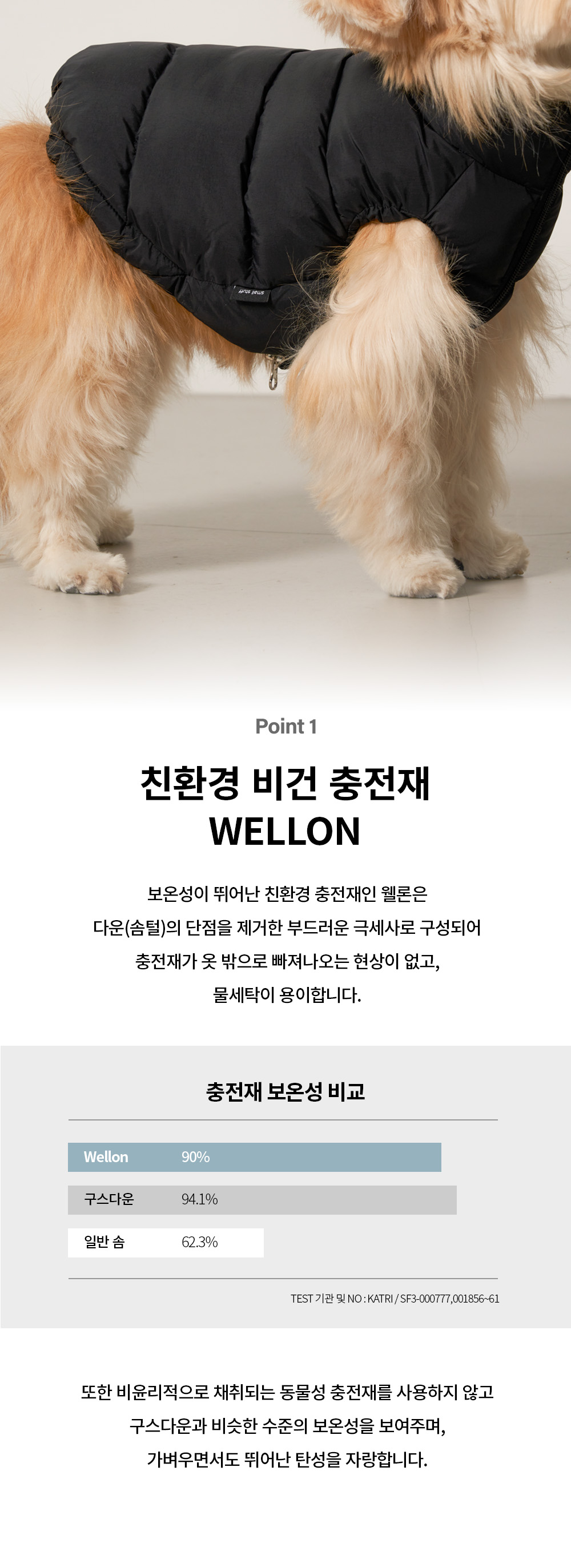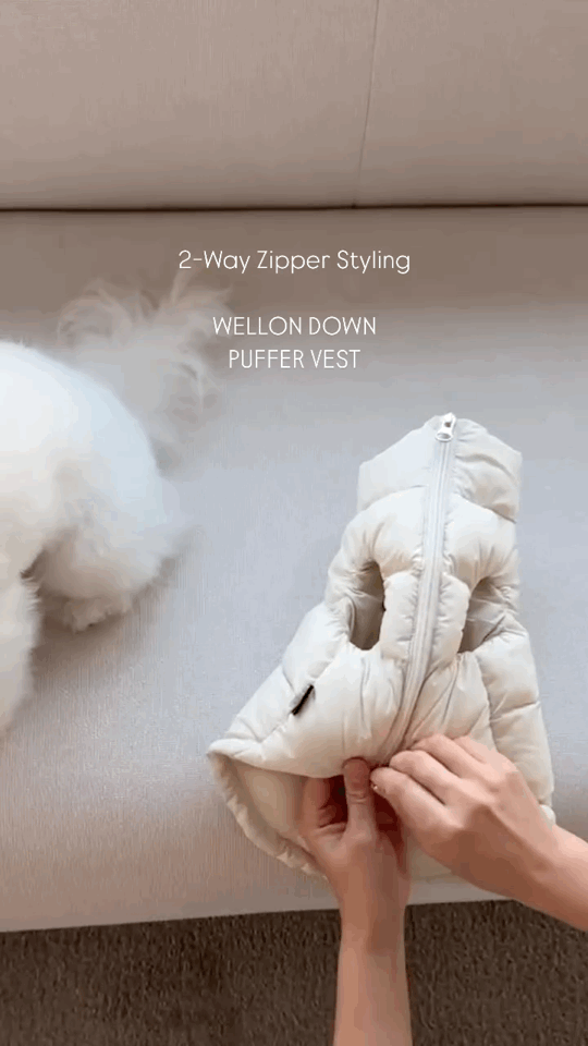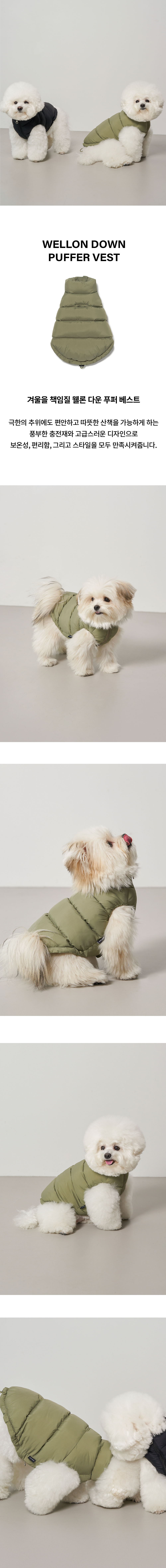 반려견을 위한 따뜻하고 실용적인 겨울 산책 필수 아이템으로 친환경 비건 충전재 웰론으로 만들어진 고급스러운 푸퍼 베스트입니다.