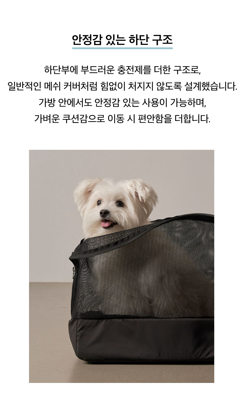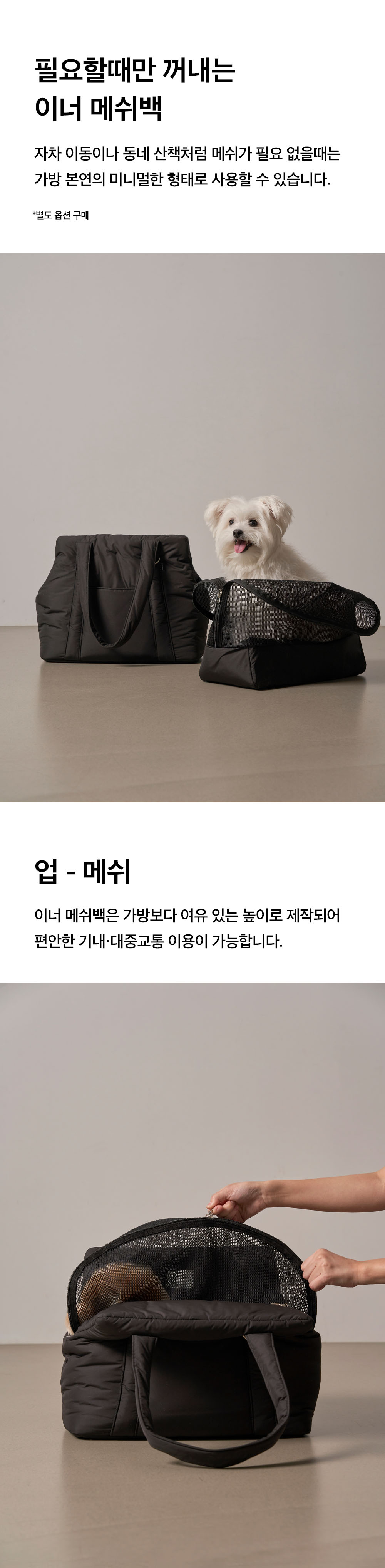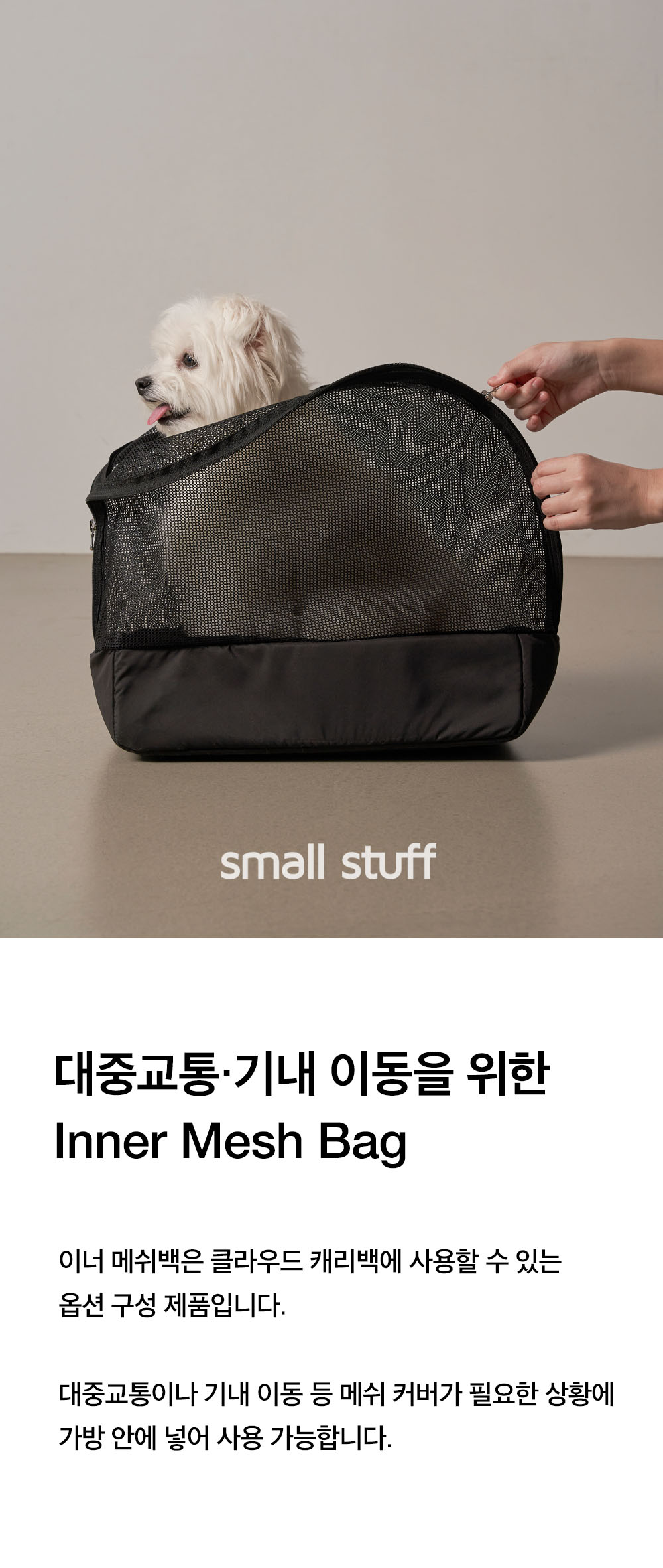 대중교통이나 기내 이동 시 메쉬 커버가 필요한 상황에 클라우드 캐리백 내부에 넣어 사용할 수 있는 이너메쉬백으로, 하단부에 충전재를 더해 메쉬 특유의 흐물거림을 줄이고 안정감 있는 사용감을 제공합니다.