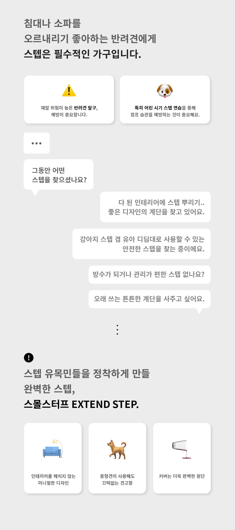 EXTEND STEP은 침대나 소파 등 높이가 있는 사람의 가구 옆에 반려견이 올라가기 용이하게 놓는 계단입니다.
