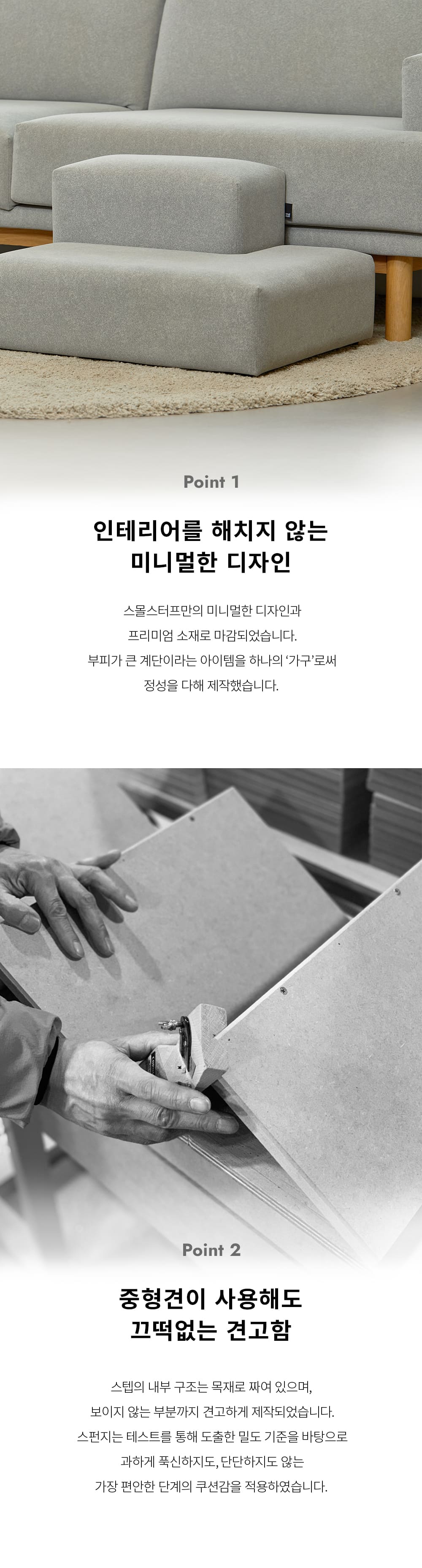 국내 최고 소파장인의 손으로 제작되며 군더더기 없고 깔끔한 디자인으로 인테리어를 방해하지 않고, 가구 옆에 놓아도 잘 어우러지는 디자인과 높은 마감 품질을 보유하고 있습니다.