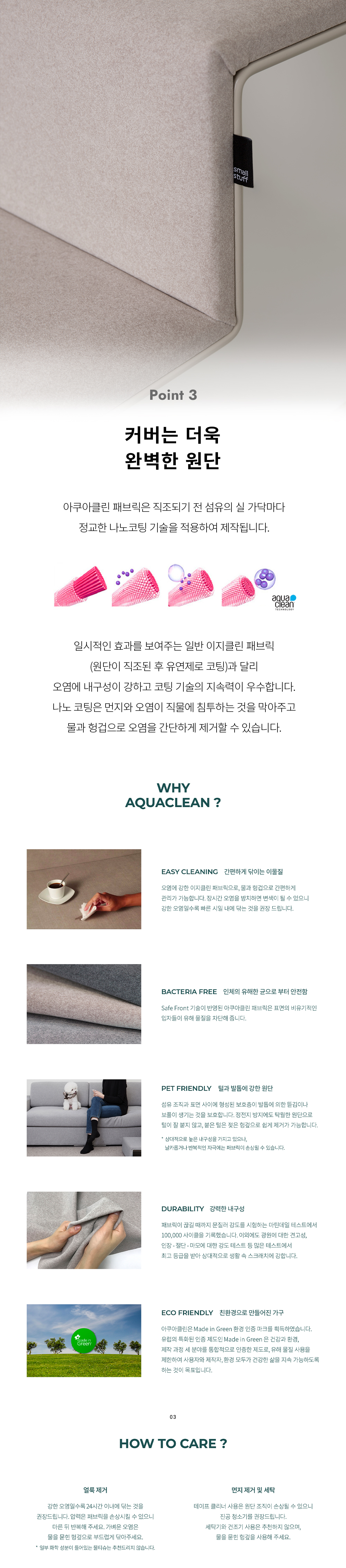 스페인산 아쿠아클린 패브릭은 강력한 내구성으로 반려동물의 발톱에 의한 뜯김이나 보풀이 생기는 것을 보호합니다.