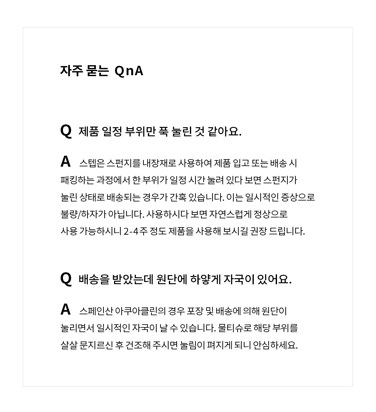 스펀지는 테스트를 통해 도출한 밀도기준을 바탕으로 과하게 푹신하지도, 단단하지도 않은 가장 편안한 중간단계의 쿠션감을 적용하였습니다.